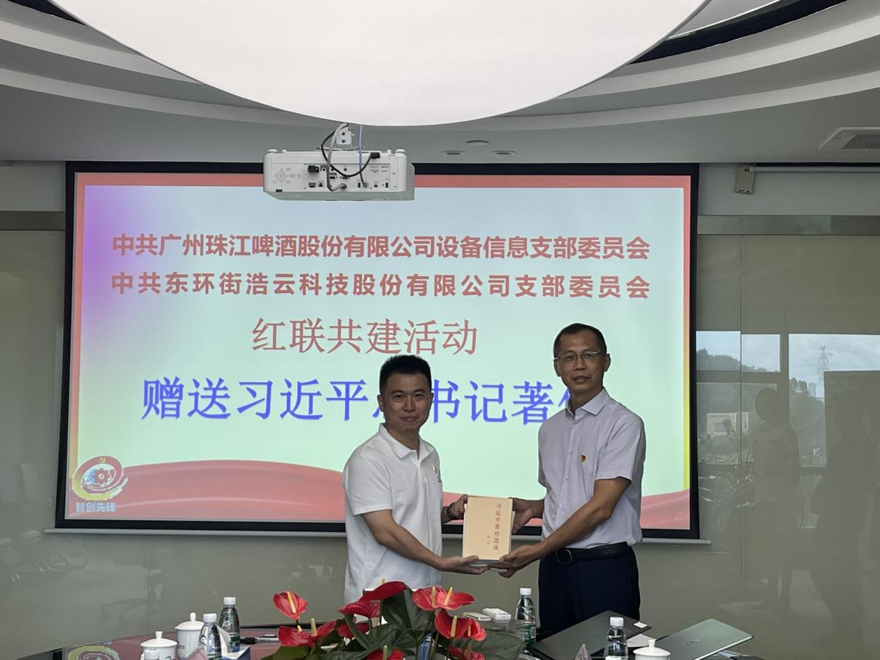 曾海濤總會計師代表設備信息黨支部向浩云科技黨支部贈送習近平總書記著作及相關學習讀本,并提出兩個黨支部要以簽訂共建協(xié)議為契機,深入學習貫徹習近平新時代中國特色社會主義思想,充分發(fā)揮共建雙方優(yōu)勢,定期交流黨建工作經(jīng)驗,互學互促,共同提高黨建工作水平。同時希望借力浩云科技在計算機信息系統(tǒng)集成、物聯(lián)網(wǎng)智能化工程等方面的技術優(yōu)勢,在珠江啤酒智能制造和綠色化工廠的基礎上,搭建未來雙主業(yè)高質量發(fā)展共享平臺,通過黨建與業(yè)務聯(lián)建,共同解決關鍵核心技術問題等任務,將黨建互促互進的政治優(yōu)勢將更好地轉化為發(fā)展優(yōu)勢,進一步推動企業(yè)高質量發(fā)展取得新成效、再上新臺階。